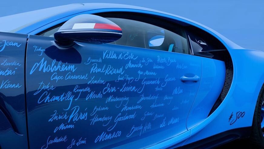 На двери и боковины кузова вручную нанесены названия событий и мест, которые сыграли важную роль в судьбе «Широна» за минувшие восемь лет. В частности, это Эра-Лессьен (трек, где была достигнута предельная скорость 490 км/ч), Поль Рикар (трасса, принимавшая заводские тесты), Женева (дебютная выставка) и Шантильи (где он неоднократно демонстрировался).