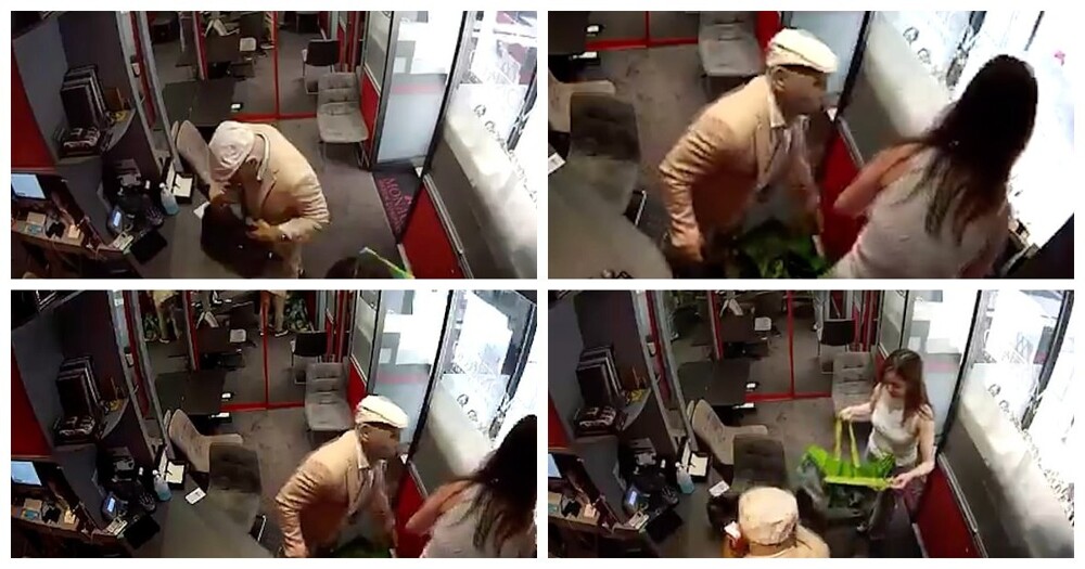 Камера видеонаблюдения запечатлела ограбление от начала и до конца. На кадрах видно, как вначале мужчина использует трость, притворяясь пожилым человеком.