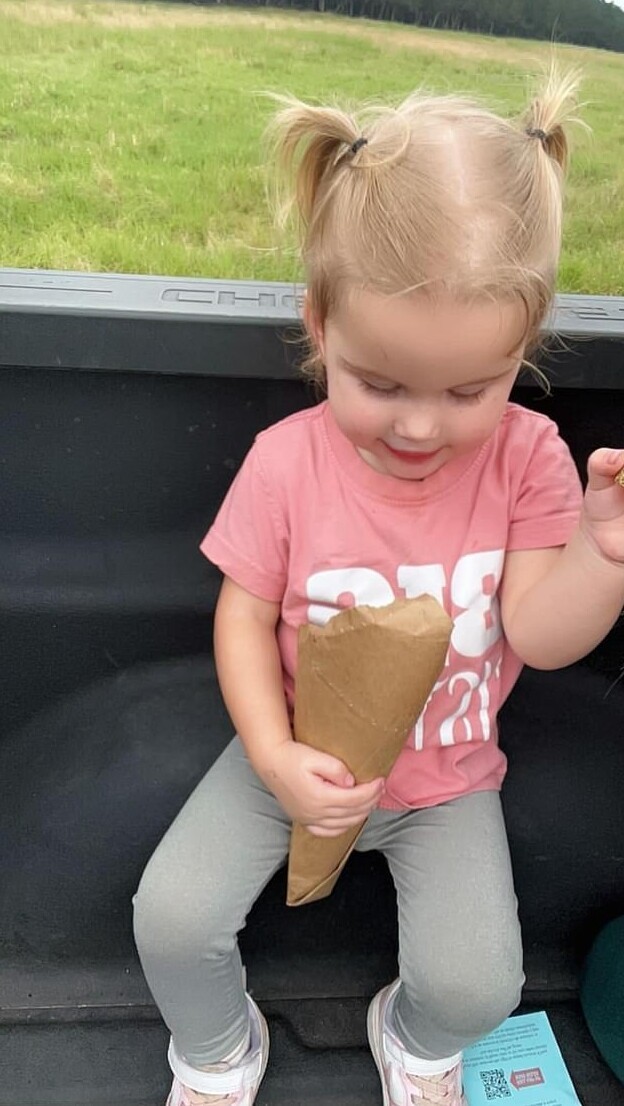 Семейная пара и их дочь Пейсли любовались животными, когда к пикапу подошёл жираф, который особенно понравился малышке.