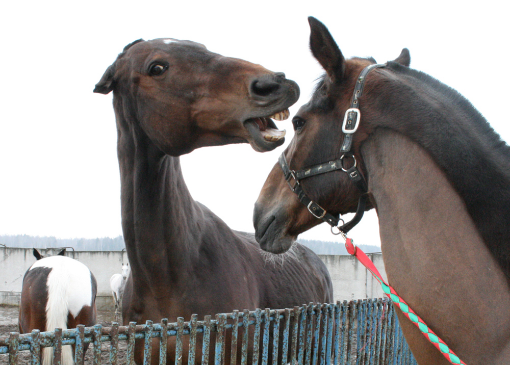 Кажется, что здесь не происходит ничего особенного. Но лошадь слева — в бешенстве. На это указывают её прижатые уши. И кусать она собирается не понарошку.