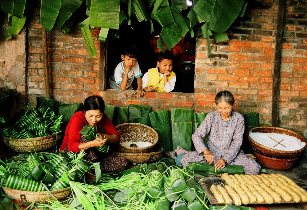 Женщины готовят закуски на фестивальный лоток, упаковывают в листья