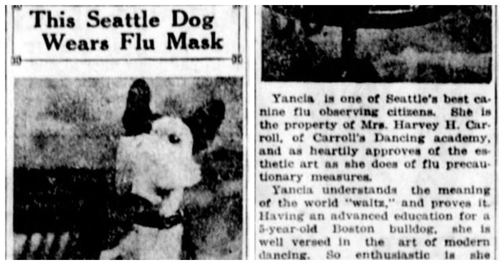 Фотография собаки попала в местную газету, как и фотография Янчии, 5-летнего бостонского бульдога, чья морда в маске украсила страницы газеты The Seattle Star в конце 1918 года. Заголовок гласил: «Эта собака из Сиэтла носит маску от гриппа», а её хозяин сказал, что «она сделала всё возможное, как и все мы».