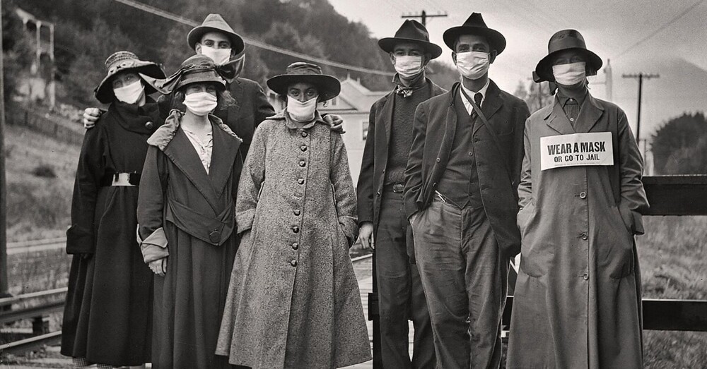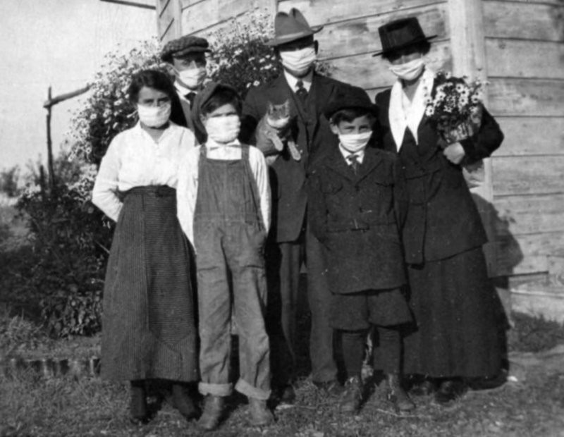 На одном из снимков времени, когда испанский грипп свирепствовал в Штатах, изображена неизвестная семья из шести человек в Дублине, штат Калифорния. На всех надеты стандартные маски того времени. Привлекательная женщина держит букет цветов. А глава семьи зажал под мышкой явно напряжённого кота в маске. Небольшие складки под правым ухом показывают, где марля сбилась в кучу, а еле различимая тень – место кошкиного носика.