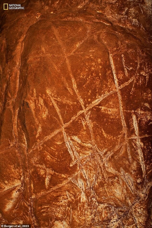 Найденные наскальные рисунки, как и захоронения, расположены в глубине пещеры в труднодоступном месте, добраться туда можно только через очень узкие тоннели. Отметины образуют геометрические узоры — кресты, иксы, треугольники, квадраты. Датировать эти рисунки очень сложно, поэтому вопрос об их возрасте остаётся открытым. Как и о том, кто является их автором. Авторы исследования, однако, считают, что кроме хомо наледи начертить эти символы в подземельях было просто некому.