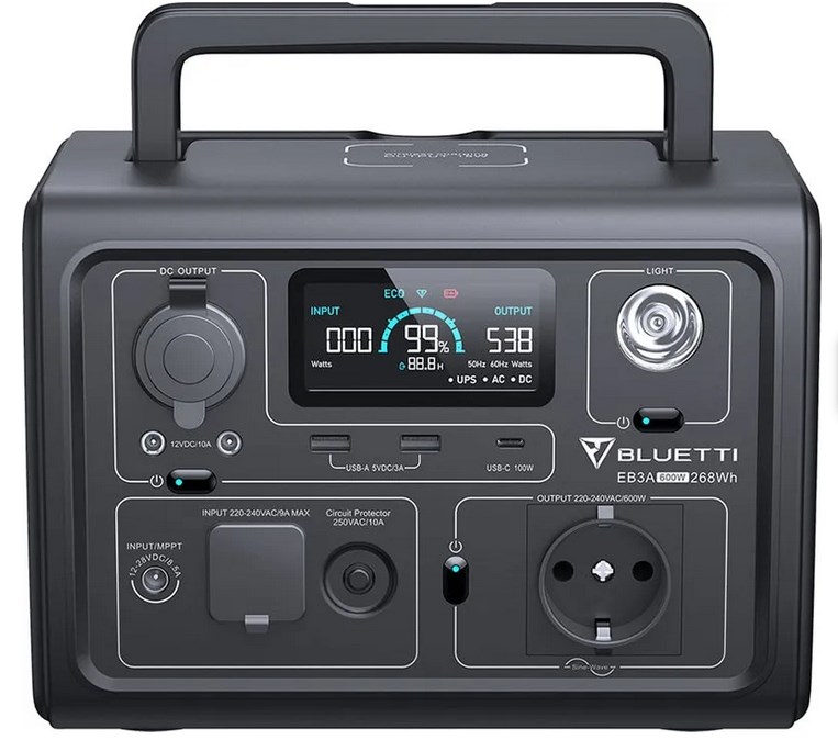 Несмотря на свои компактные размеры, Bluetti EB3A обеспечивает высокую мощность до 600 Вт и емкость аккумулятора 268,8 Втч. Это позволяет заряжать и питать множество устройств, включая смартфоны, ноутбуки, лампы, холодильники и другие бытовые приборы.