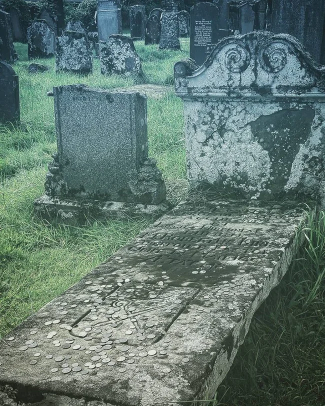 Монеты, оставленные на могиле Роберта Кирка в церковном дворе Аберфойла