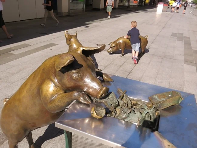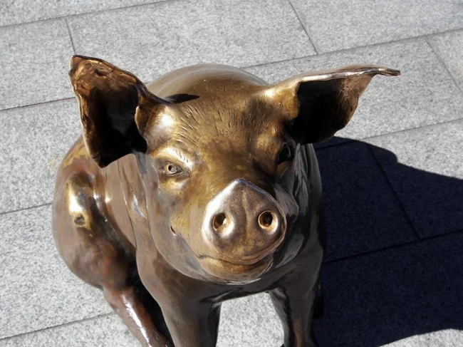 Судя по виду этих четырёх бронзовых свиней в натуральную величину, они действительно отлично проводят день. Одна хрюша зарылась мордой в мусорный бак, радостно забронзовев от смятого пакета молока, апельсиновой кожуры, недоеденного банана и огрызка яблока. Другой свин сидит, удобно разместив на тротуаре внушительные полупопия. А ещё один мчится, чтобы присоединиться к всеобщему веселью. Все поросята в буквальном смысле сияют от любящих объятий и поглаживаний детворы и прохожих.