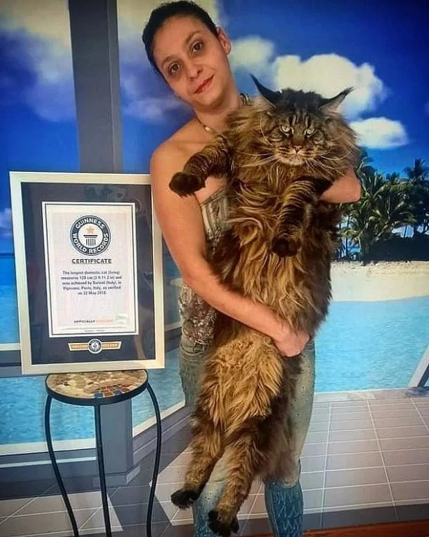 Впервые красавец породы мейн-кун побил рекорд, когда ему было всего два года, но уже тогда он был длиннее бейсбольной биты.