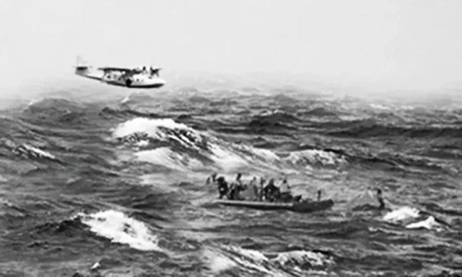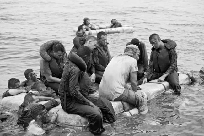 Тех, кто не утонул вместе с кораблём, разметало на почти 250 квадратных километров по океану. Более трёх дней морякам пришлось фактически провести среди акул. Кто-то заранее успел надеть спасательный жилет, некоторые нашли на воде плоты и крупные плавучие обломки судна, что позволило им держаться на плаву.