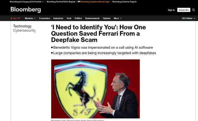Ferrari начала внутреннее расследование. Отмечается, что инцидент является одним из ярких случаев использования инструментов deepfake для проведения живого телефонного разговора с целью проникновения в международно признанный бизнес. Это не первая подобная попытка выдать себя за высокопоставленного руководителя. В мае Марк Рид, генеральный директор рекламного гиганта WPP Plc, также стал целью неудачной, но столь же сложной аферы с дипфейком.