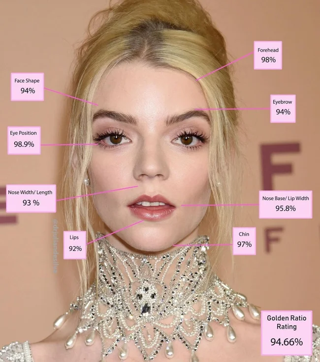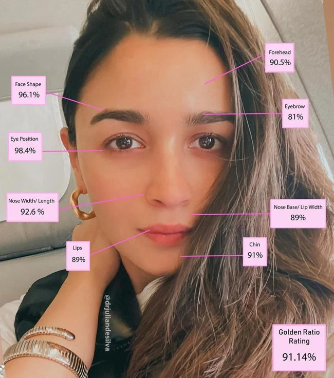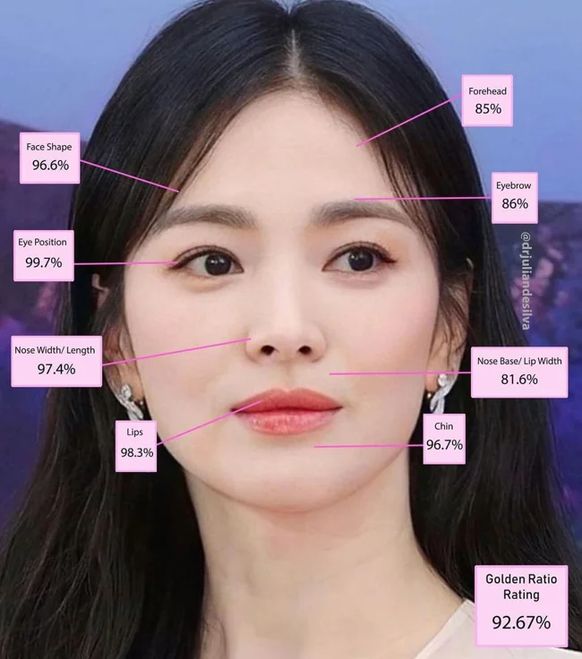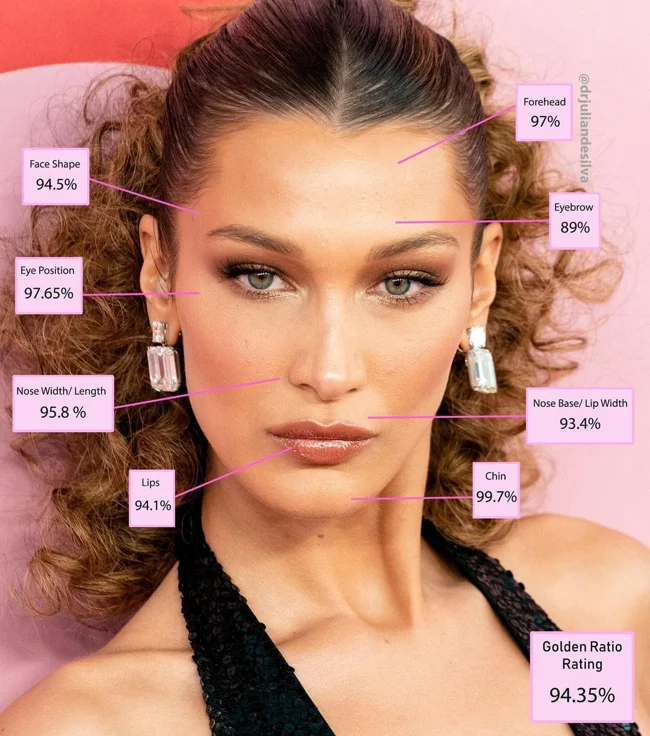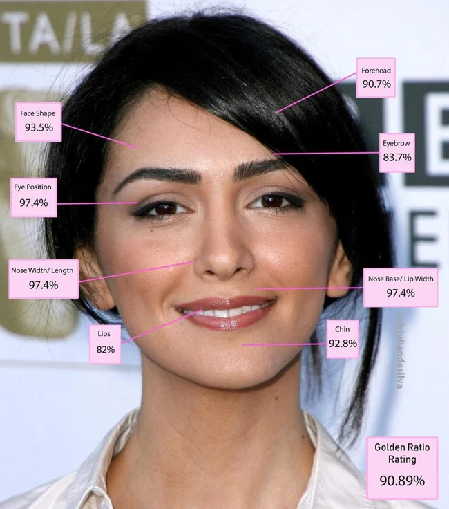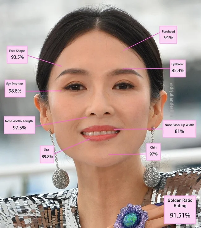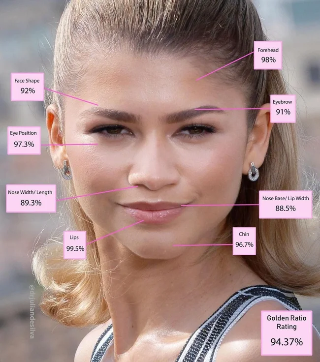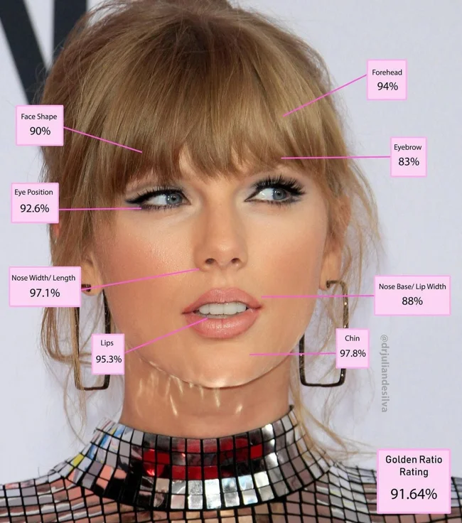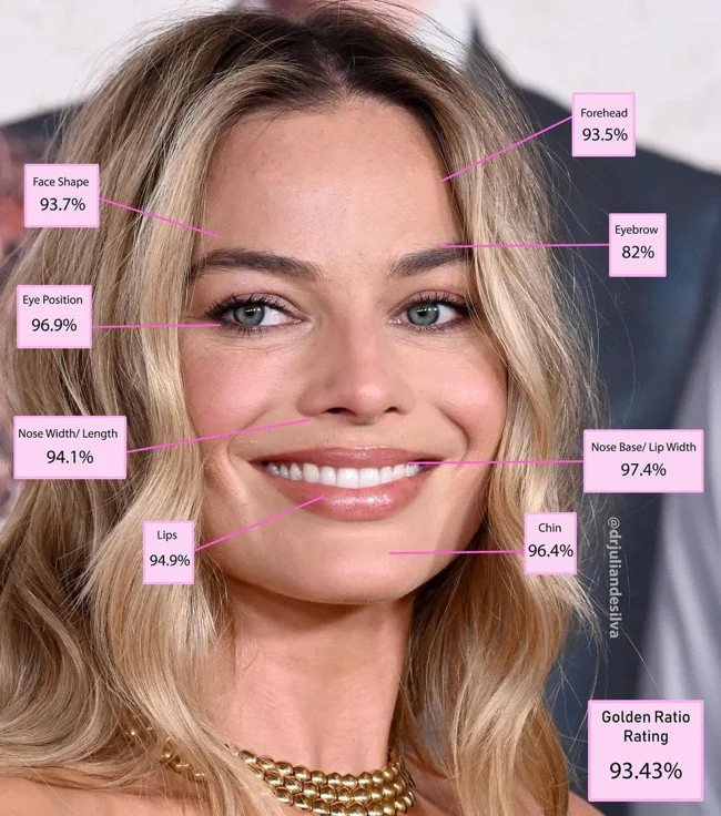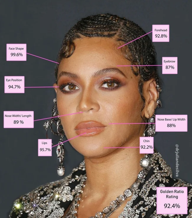 Известный в СМИ британский лицевой пластический хирург Джулиан Де Сильва опубликовал ежегодную десятку самых красивых знаменитых женщин планеты. Он составляет рейтинг, исходя из правила золотого сечения, и даёт процент близости к идеалу восьми характеристикам: форма лица, лоб, расположение глаз, брови, ширина/длина носа, основание носа/ширина губ, губы в целом и подбородок.