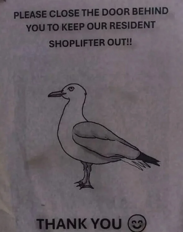 Сейчас возле магазина висит табличка с фотографией наглой чайки, напоминающей плакат «Разыскивается», и надписью: «Пожалуйста, закрывайте за собой дверь, чтобы не впустить нашего местного воришку».