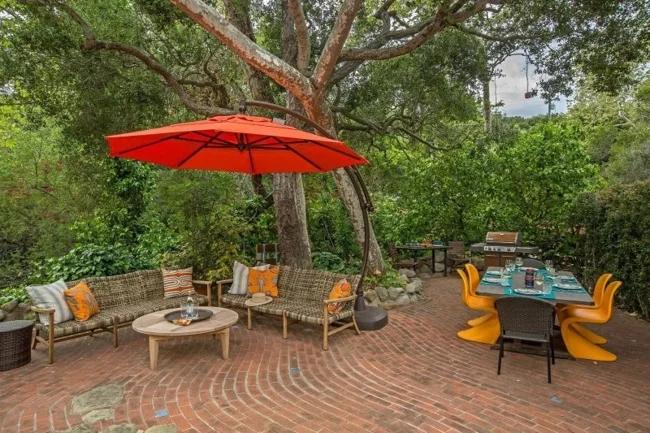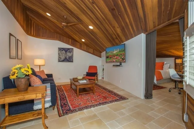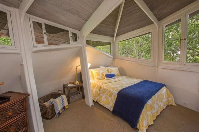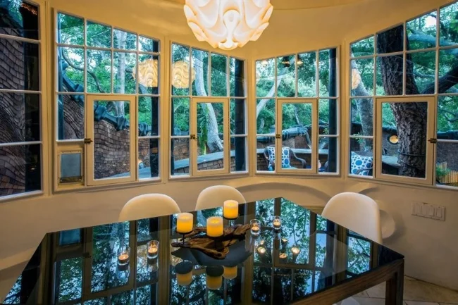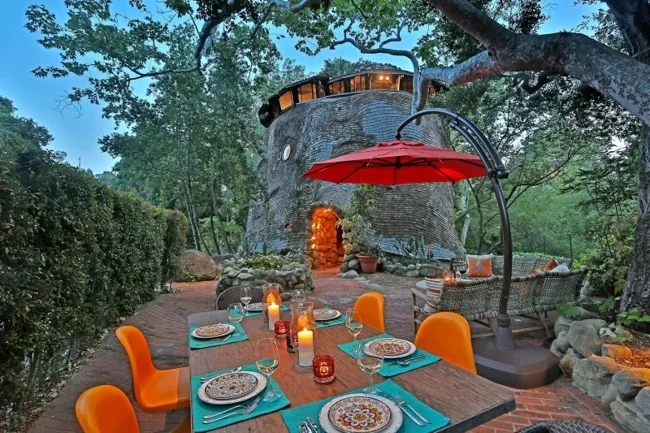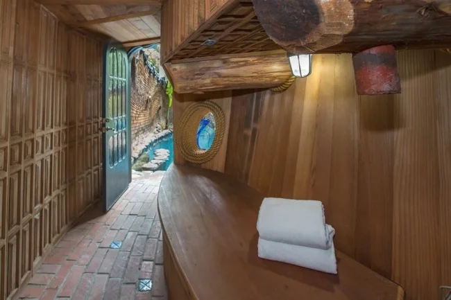 Здесь оборудована спиралевидная лестница, выходящая на улицу, облицованная камнем шахта лифта, окна с витражами, из которых открывается восхитительный панорамный вид, волнистые стены с венецианской штукатуркой и основательные деревянные колонны и балки. Брюхо кита – это внутренний дворик с летним душем и комнатой для отдыха.
