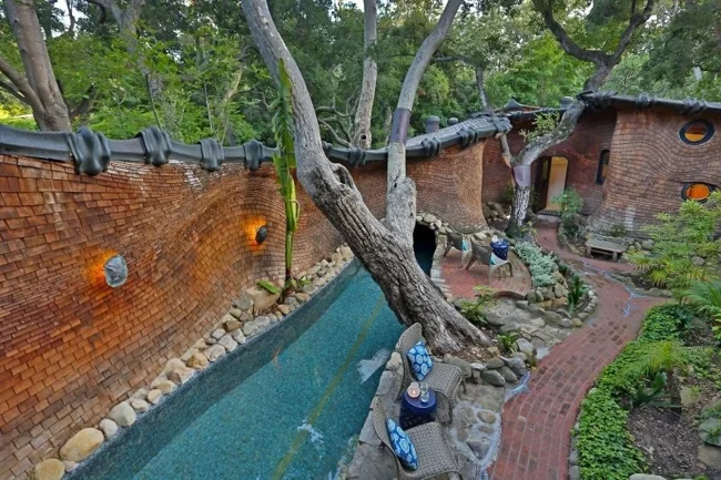 К хвосту животинки (отдельно стоящему гостевому дому) ведет 23-метровый бассейн. Обыгрывая название дома, Кармайкл завалил вход камнями, чтобы имитировать зубастую пасть, и использовал высоко расположенный витраж в качестве глаза водного млекопитающего.