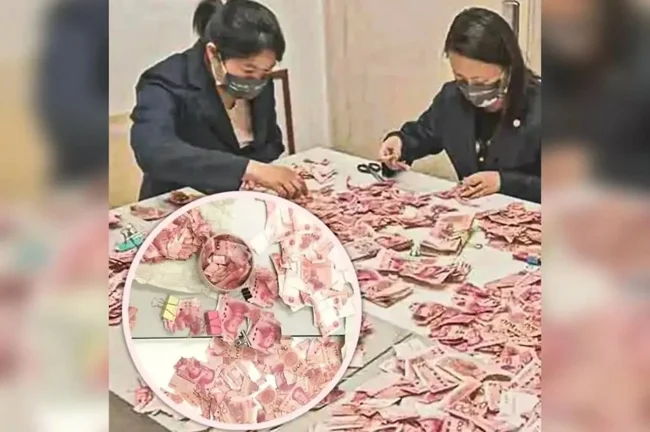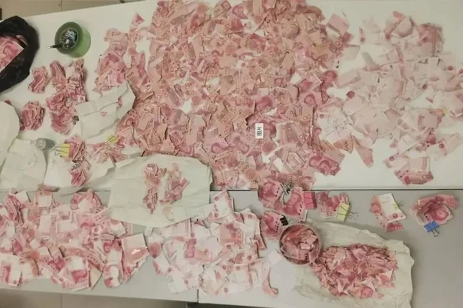В Куньмине женщина по фамилии Чжан принесла в Промышленный коммерческий банк Китая мелкие фрагменты купюр с просьбой их восстановить. Она рассказала, что пять лет назад банкноты порезала её невестка, которая страдала психическим расстройством и сильной депрессией.