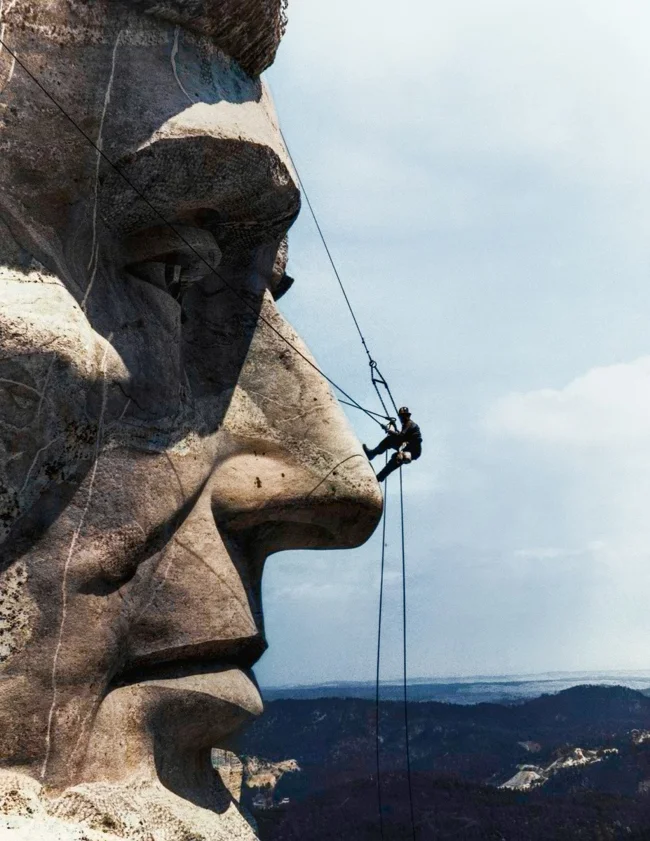Рабочий на лице Авраама Линкольна на горе Рашмор, 1962 год.