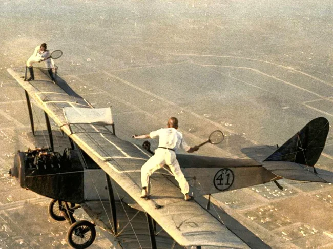 Каскадеры Глэдис Рой и Айвен Ангер играют в теннис на крыле биплана в полете, 1925 год.