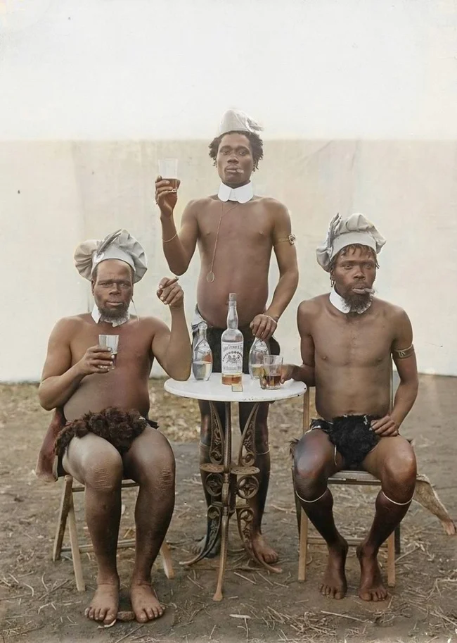 Фотография скорее всего была сделана колонизаторами. Нарядили туземцев в шапочки и в стаканы налили напиток, смешно очень...