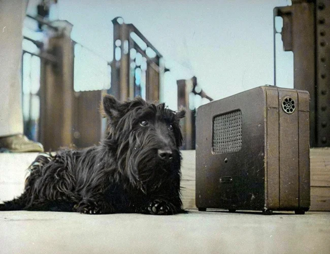Скотчтерьер по кличке «Фала». Любимая собака президента Франклина Рузвельта, слушает его выступление по радио, 1944 год.