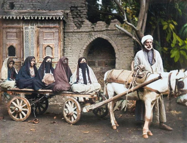 Араб с тремя женами и двумя служанками. Египет 1870-х годов.