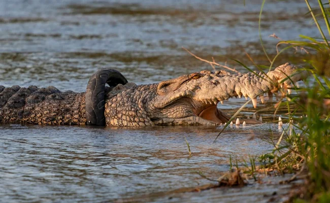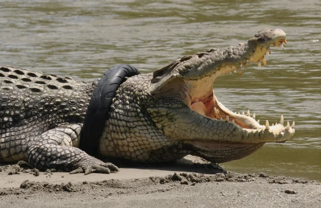 Возможно, крокодил и не хочет лишаться шины, она ему шею защищает!