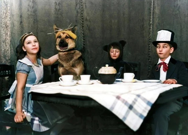 Дети исполняют сцену безумного чаепития из «Алисы в Стране чудес», Англия, 1930 год.