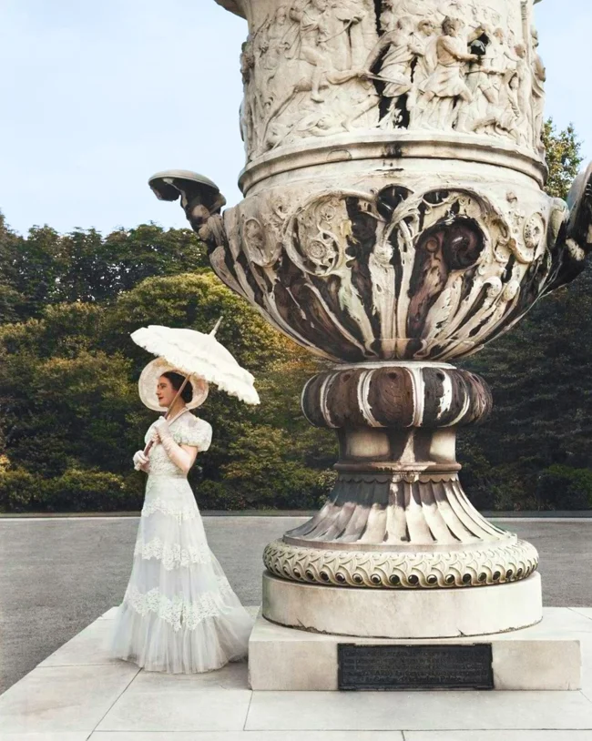 Королева Елизавета позирует возле монументальной вазы времен Ватерлоо. Букингемский дворец, 1939 год.