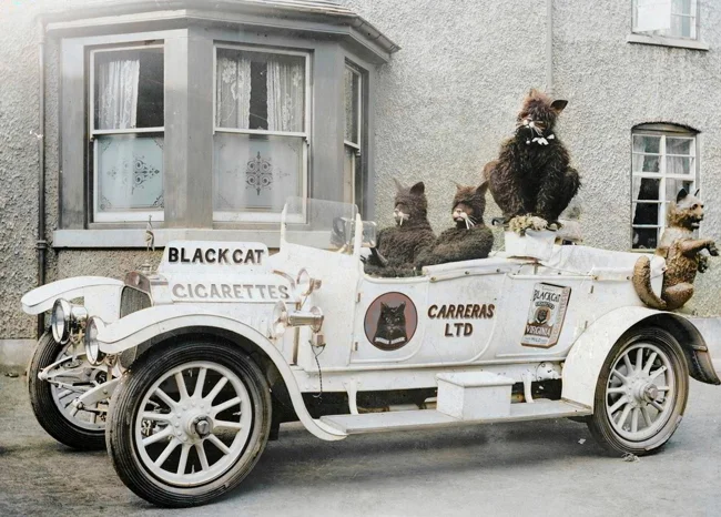 Изготовленный по индивидуальному заказу автомобиль рекламирует сигареты Black Cat, Англия, около 1915 года.