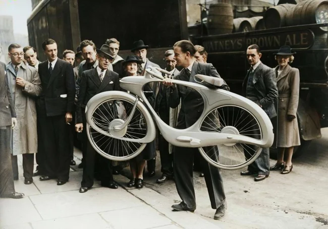 Дизайнер Бенджамин Боуден с прототипом своего велосипеда Spacelander, 1946 год.