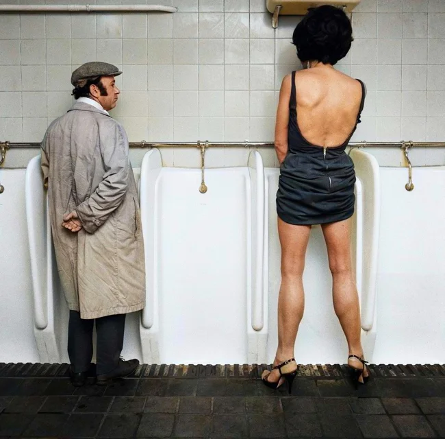 Актер Рон Сторм (справа) в туалете, 6 августа 1970 года, Великобритания.