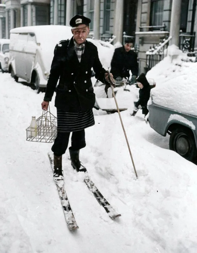 Молочник доставляет молоко на лыжах по заснеженной улице Лондона. 31 декабря 1962 года.