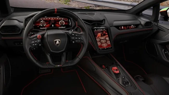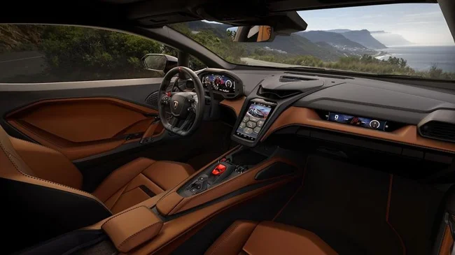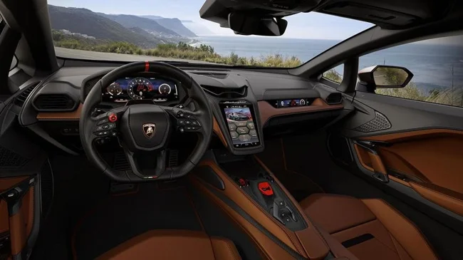Интерьер суперкара не сильно отличается от старшего Revuelto. На передней панели расположены три дисплея: цифровая приборная панель, вертикальный тачскрин медиакомплекса и небольшой экран перед пассажиром, на который дублируются некоторые показатели с водительского щитка. Большей частью бортового функционала управлять предлагается либо с центрального дисплея, либо с кнопок на руле.