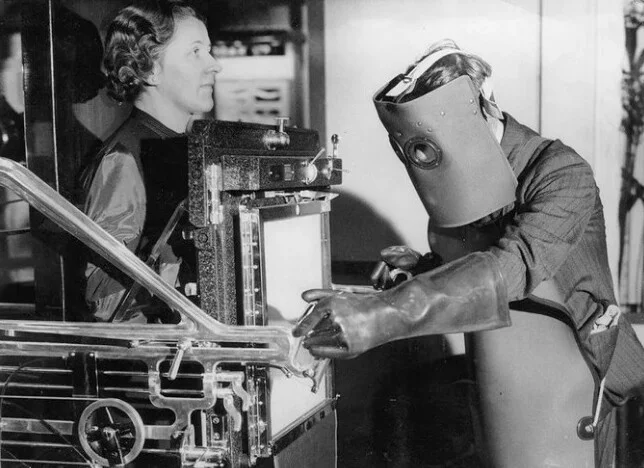 23. Новейший рентгеновский аппарат, которым управляет врач-рентгенолог в защитном костюме старого образца. Больше он ему не понадобится, 1934 год