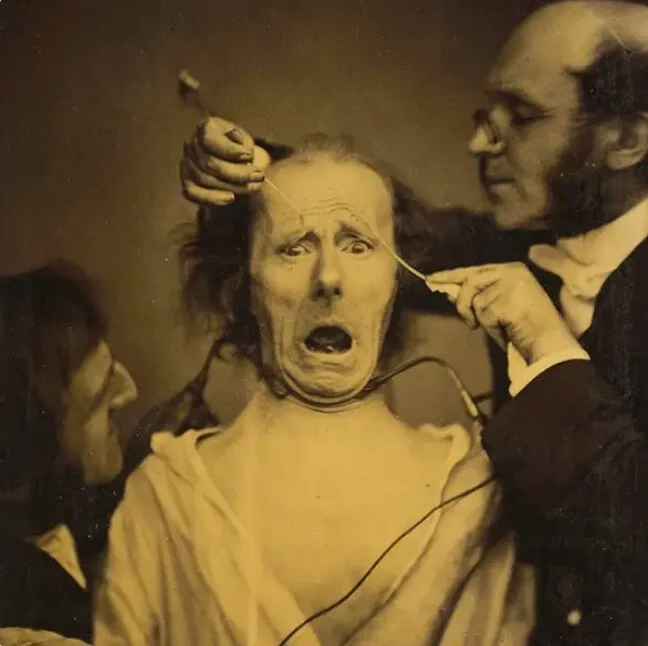 20. Французский невролог Гийом Дюшенн проводит эксперимент по электрофизиологии, воздействуя на мышцы испытуемого с помощью электрических зондов для вызова определенной мимики, 1850-е годы