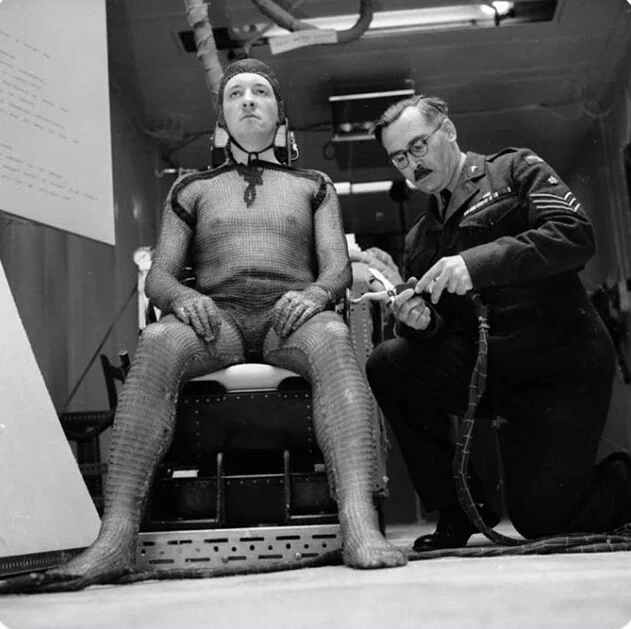 Cнимок сделан во время эксперимента по исследованию рефлекторных движений глаз и их связи со зрительными иллюзиями в Институте авиационной медицины RAF в Фарнборо, 1960 г.