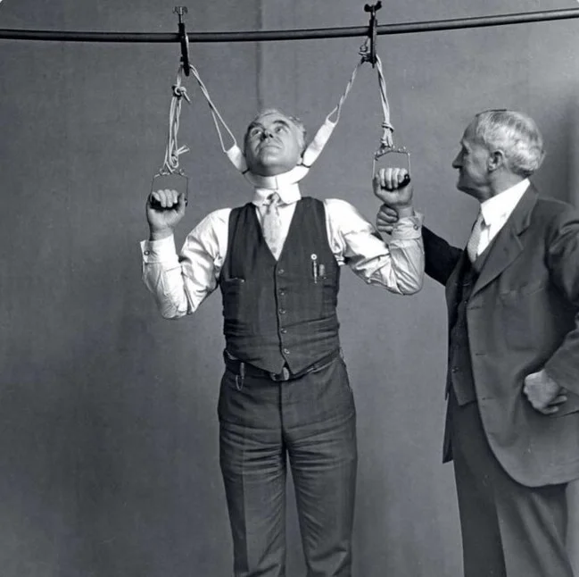 24. Пациент и врач испытывают устройство для растяжки, которое якобы увеличивает рост на 2-6 дюймов, 1931 г.