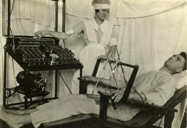 12. Кресло Bergonic Chair для проведения электротерапии с целью психологического воздействия при психоневрозах, эпоха Первой мировой войны