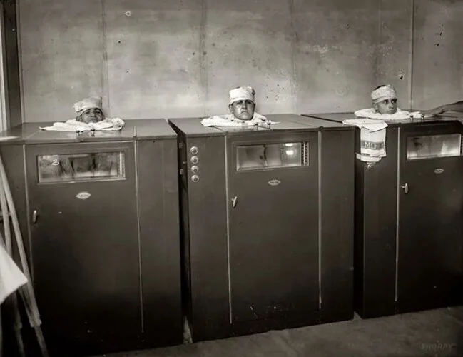 30. Это паровые бани, которые использовались для физиотерапии, 1920 г. Судя по лицам пациентов, особого комфорта они не испытывают ![]()