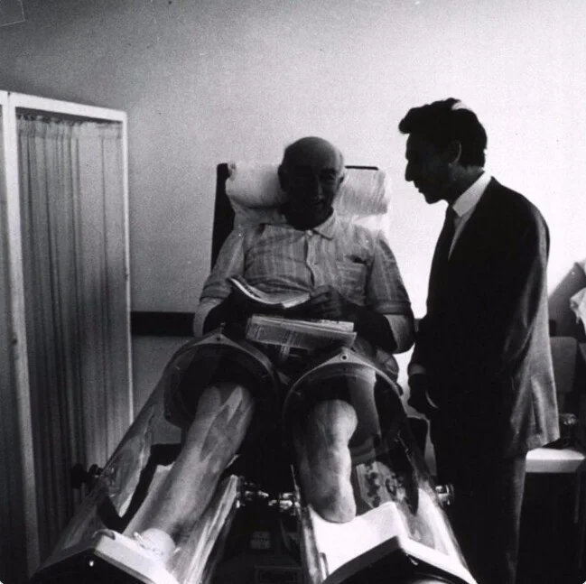 2. Пациент в аппарате «Железные легкие» — аппарате искусственного дыхания, примерно 1938 г.