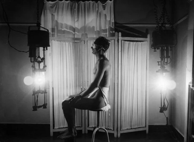 18. Пациент на сеансе светотерапии с использованием ламп солнечного света, 1930 г.