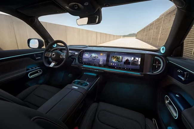 В интерьере паркетника применено сразу три дисплея, которыми укрыта практически вся передняя панель. Приборы получили диагональ 10.3 дюйма, центральный и пассажирский экраны имеют по 13 дюймов. Обещана также 25.6-дюймовая проекция на стекло. Медиасистема работает на продвинутом софте с элементами искусственного интеллекта: голосовой помощник способен поддерживать беседу на отвлечённые темы. Специально разработана акустическая система из 20 динамиков.