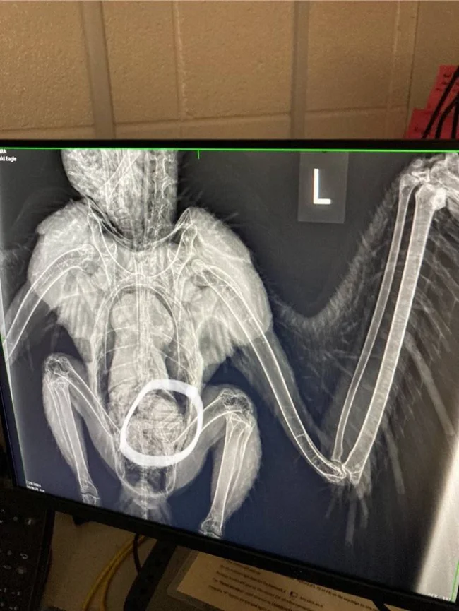 Орлану сделали рентген. Он показал, что хищник недавно съел целого енота. Из-за резко набранного крупного веса и раздутого живота птица не могла взлететь. «[Он стал] слишком толстым, чтобы летать», — отметили сотрудники департамента.