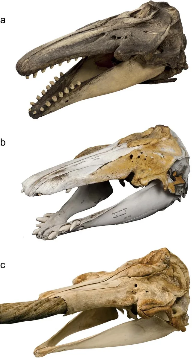 Для обычного человека, не специалиста по анатомии, череп белухи ничем не отличается от черепов других китообразных. Нарвала же легко опознать по трёхметровому спиральному зубу длиной в 2-3 метра. Ну а нарлуга совместила оба варианта: её зубы крупные, спиральные и вывернуты наружу, но не выходят далеко за пределы челюсти. Удобно ли было кушать такой странной пастью? Скорее всего нет. Но нарлуга оказалась достаточно жизнеспособна, чтобы вырасти во взрослую особь. А это уже немало.