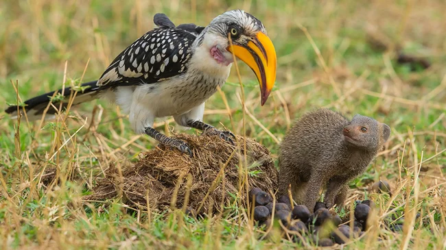Сила дружбы карликовых мангустов настолько велика, что они наладили коннект не только друг с другом, но и с другими видами! Да не абы с кем, а с птицами-носорогами. Эти крупные пернатые и сами мангустами могут закусить!