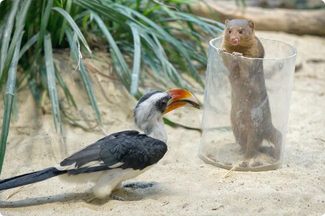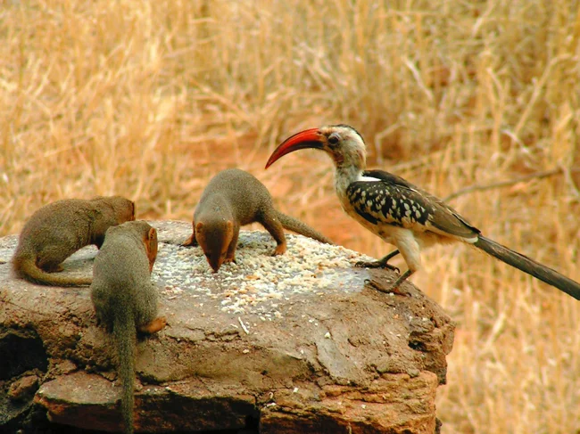 Между мангустами и птицами устанавливается крепкая связь. Оба вида синхронизируют дневные циклы, чтобы выходить на охоту одновременно. А чтобы понимать друг друга лучше, зверьки и птицы разрабатывают специальные сигналы, которые понятны каждому из них! И это идёт на пользу всем. В стайках, где мангусты дружат с птицами-носорогами, поголовье больше, чем в группах без пернатых товарищей. Численность птиц-носорогов, соседствующих с мангустами, тоже становится больше, ведь им легче растить потомство.