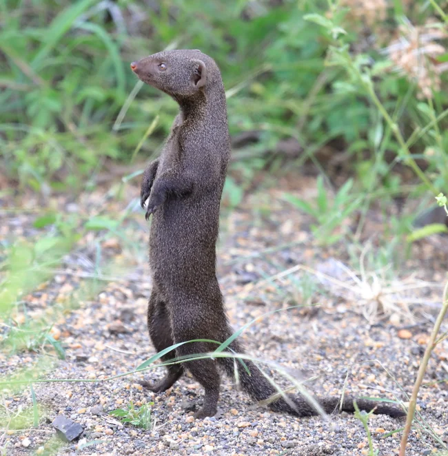 Мангуста-часового заметить несложно. Он стоит на задних лапах и нервно смотрит по сторонам.