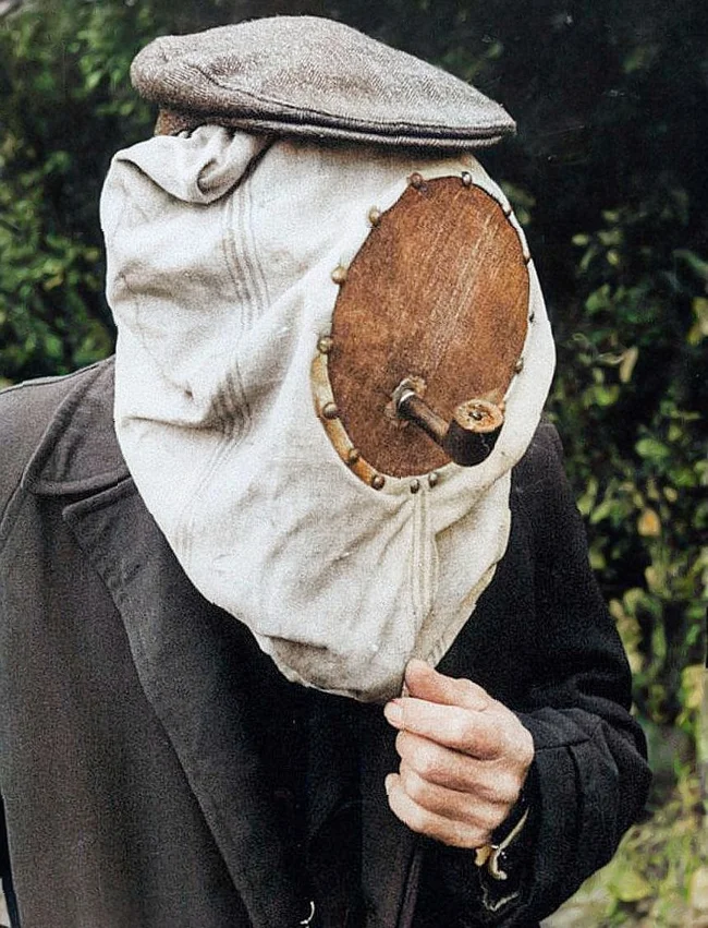 Использует специальную защитную маску с отверстием для трубки, через которую направляется дым, служащий средством для отпугивания пчел,