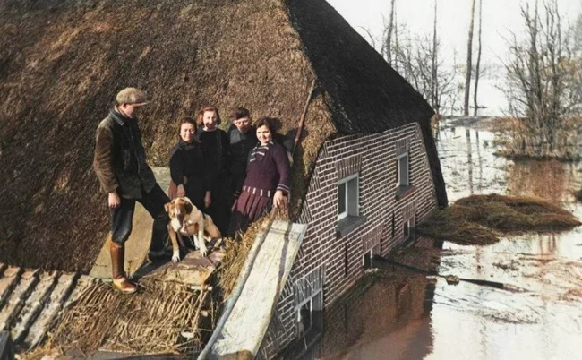 Голландская семья спасается на своей крыше во время большого наводнения в Северном море в 1953 году. 70 000 человек были вынуждены покинуть свои дома во время наводнения.