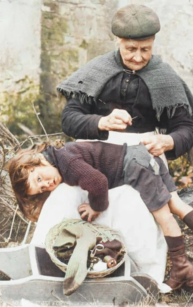 Корнуоллская бабушка зашивает одежду своего внука. Англия, 1907 год.