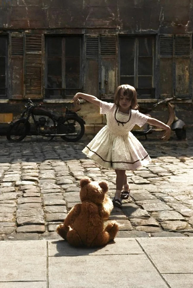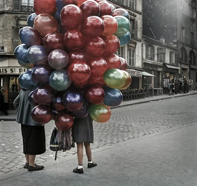Женщина и девочка, спрятавшиеся за воздушными шарами. Париж, 1949 год.
